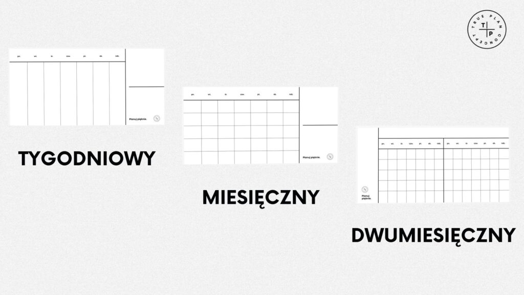 Planner True Plan Concept to minimalistyczny kalendarz na ścianę. Wkładki z wzorem kalendarza można wymieniać, tak by dopasować używany wzór do swoich aktualnych potrzeb. Większość wzorów ma swoje wersje w ujęciu pionowym i poziomym.